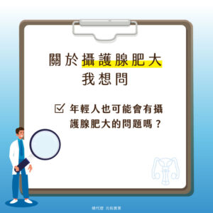 40歲以下的年輕人原則上不太會有攝護腺肥大的問題,但年輕人也常出現下泌尿道症狀或是排尿功能障礙,大部分可能是其他因素造成的。最常見的就是水分攝取不足,或是喝水太急太快、量太大,久坐,騎腳踏車等等。
