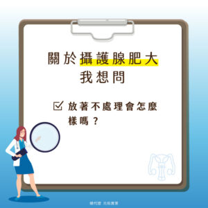 攝護腺肥大是一個不可逆的疾病,通常處理的原則會依照病人「主觀」困擾的程度、「客觀」尿流速以及是否有其他併發症來決定。如果不處理的話可能會出現尿滯留,需要反覆插尿管;膀胱結石、血尿,嚴重一點甚至造成尿路阻塞進而影響腎功能。通常出現併發症就是需要積極處理攝護線的重要指標,甚至建議進行手術治療,避免後續併發症。
