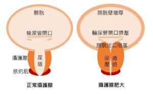 攝護腺的位置位在膀胱的下方,而膀胱的出口緊接著尿道,部分的尿道就被攝護腺包圍著。隨著男性年齡增長,攝護腺也會隨之增生,也就是細胞會增加。而當攝護腺肥大時,就會壓迫到尿道的管徑,擋住了尿道的出口,或是壓迫到膀胱,就會造成排尿不順、頻尿、夜尿等等的問題。而當攝護腺肥大的問題產生時,膀胱需要更用力才能排出尿液,但又因為有尿液滯留,而造成膀胱壁持續被用力展開,肌肉會越來越無力收縮,導致不少併發症。例如膀胱結石等等。建議民眾可先藉由國際攝護腺症狀評分表(IPSS)來自我評估嚴重程度。