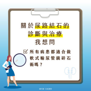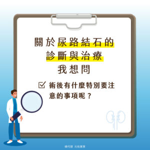 最常見的比方說結石越大、手術時間越長,病患出現合併腎臟積水等等的狀況;或是術前就知道感染,病患多次做過泌尿內視鏡手術且成效不彰的時候,這些都是術後併發感染的高風險群,我們術前都會給預防性的抗生素,減低術後的感染風險。