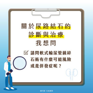 軟式輸尿管鏡最常見的風險或併發症除了麻醉風險之外,最常見的還是感染和出血,但大部分都蠻輕微的。我們術前都會給預防性的抗生素。