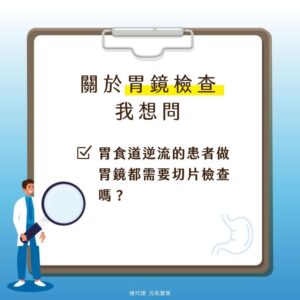 胃中如果有潰瘍或是其他問題的話當然要做切片檢查,但針對胃食道逆流的話要先看病患有沒有巴瑞特食道症,或是病患的賁門部分有沒有結節狀的變化,如果有的話就要做切片檢查,看看有沒有細胞變異,細胞變異就是癌症的前期,化驗看有沒有癌前病變。