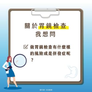 併發症的部分,吸入性肺炎是我們最需要顧忌的,或是做到一半氧氣不夠、呼吸窘迫等等。做胃鏡前一定要空腹,若做的過程中有食物溢出來很容易造成病患嗆到造成危險。