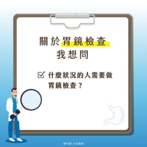 還有若是有臨床症狀:比如長期反覆胃痛、體重減輕等等,或是經常性的胃食道逆流,都應考慮接受胃鏡檢查,排除相關疾病。通常第一次做完胃鏡檢查之後,醫生會發現有沒有長期需要追蹤的病灶,特別是巴瑞特食道,可能進一步產生食道癌的風險,或是萎縮性胃炎容易產生胃癌,畢竟我們永遠不知道事情什麼時候會發生,所以記得接受醫師的建議,定期追蹤,接受檢查!