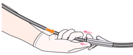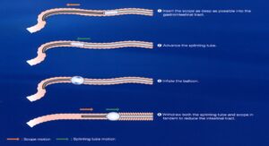 - 將小腸鏡和外套管同時往回拉,縮短小腸腸道
