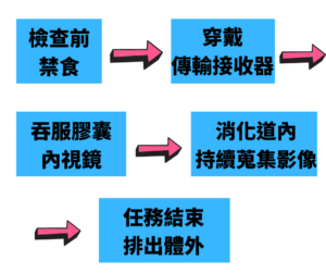 膠囊內視鏡是一台有燈光、微型照相鏡頭、影像感應傳輸器與電池的迷你照相機,縮小到約莫一顆魚肝油膠囊的大小,透過病人配開水吞服入肚子後便會隨著腸胃蠕動而前進,同時進行影像擷取。每秒拍攝兩張即時影像,並藉由光感受晶片得到的影像訊號傳送到接收器,等膠囊內視鏡沒電之後,便會隨著糞便排出,結束它完整的檢查任務。